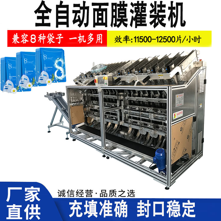 8頭全自動(dòng)面膜灌裝機(jī)的灌裝速度為:9000-11000片/小時(shí)